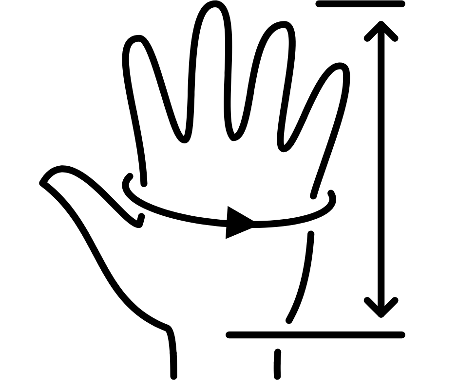 Massband an der breitesten Stelle um die Handfläche direkt unterhalb der Fingerknöchel anlegen. Der Daumen bleibt aussen vor. Jetzt das Maß ablesen und anhand der Tabelle die Handschuhgröße bestimmen.